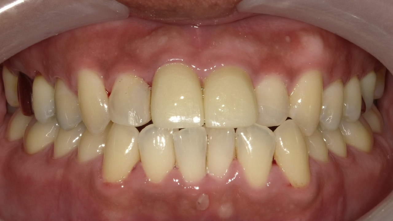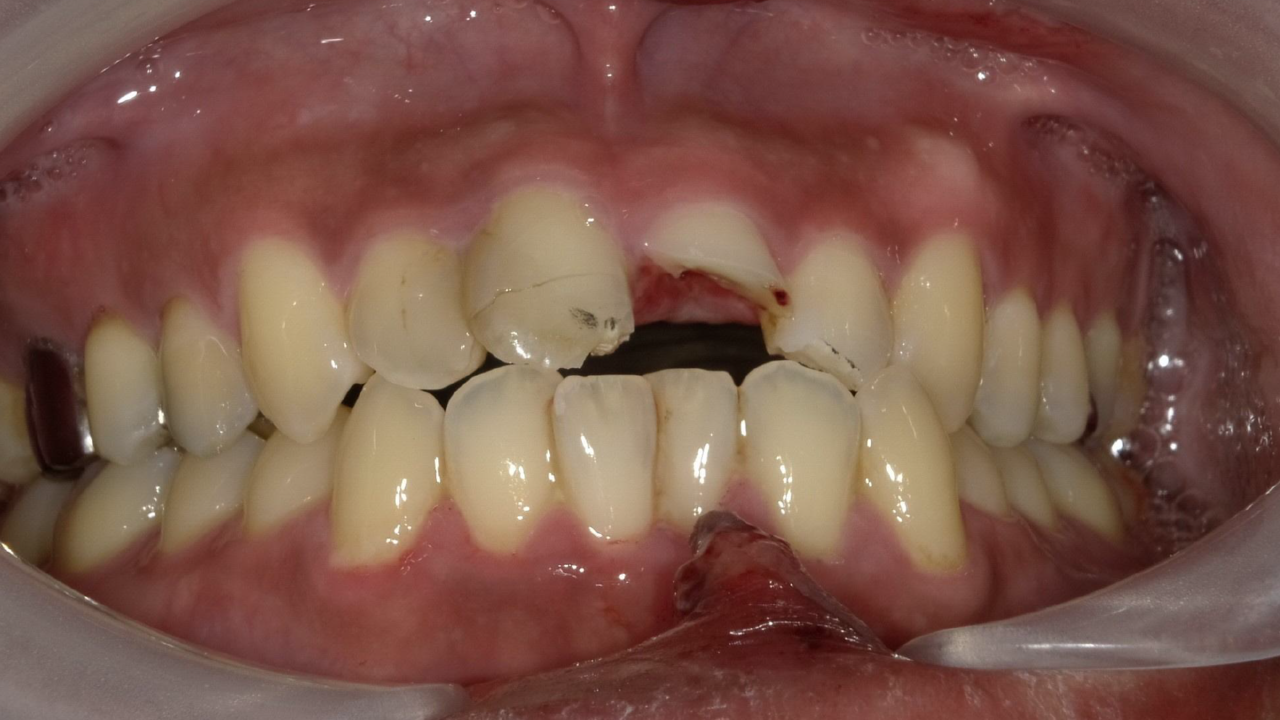 キックボードで転倒し前歯を受傷されました。上の前歯は2本とも歯冠が割れていて歯の神経が見えている状態でした。抜歯はせず、歯を出来る限り残した治療を予定しました。神経の治療後、審美的にジルコニアクラウンを希望されました。治療後は痛みもなく、見た目も綺麗で抜歯もせず治療ができたと大変満足されていました。