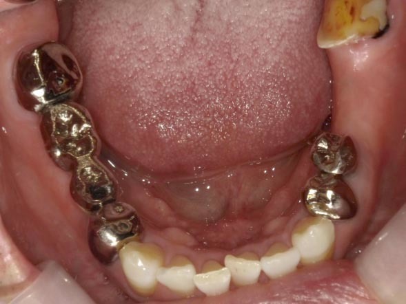 尖っている歯は形を整え、根だけ残した状態(残根上の入れ歯)としました。入れ歯は、金属アレルギーが極力ない、薄くて違和感の少ない入れ歯を希望されていたため、チタン床の入れ歯で治療を進めました。